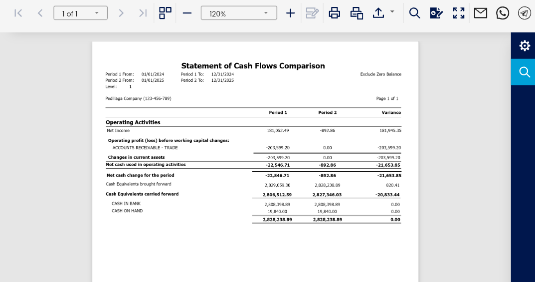 You’re preparing quarterly financial reports and need to compare cash flow activity between Q1 and Q2. You want to highlight shifts in operating efficiency, investment decisions, and financing sources, and ensure the report aligns with your General Ledger and Trial Balance. You also need to export the report for board review and audit documentation.