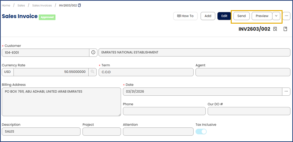 The accounting team uses Sales Invoices to monitor outstanding balances and follow up on unpaid customer accounts, improving cash flow management.