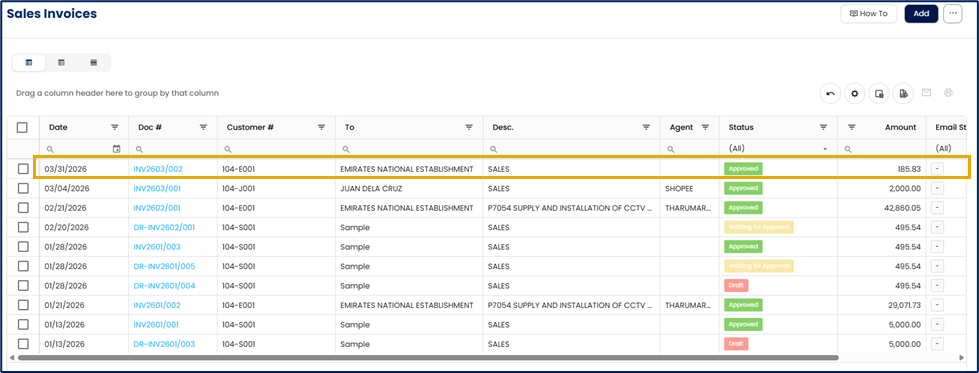 Confirm that the invoice is successfully saved and appears in the Sales Invoice list.