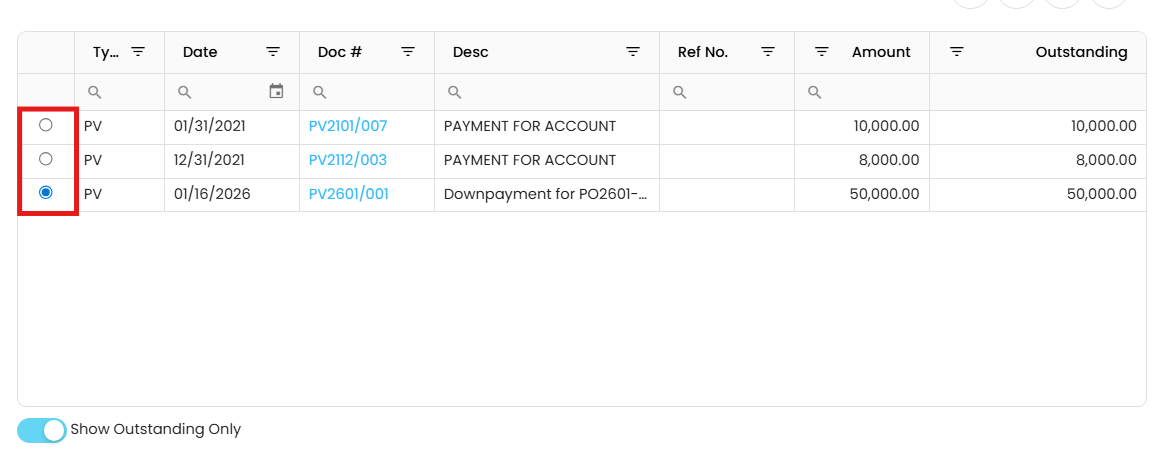 In the top table, which lists Pay Bills (advance payments) and Supplier Credit Notes, select the transaction you want to apply.