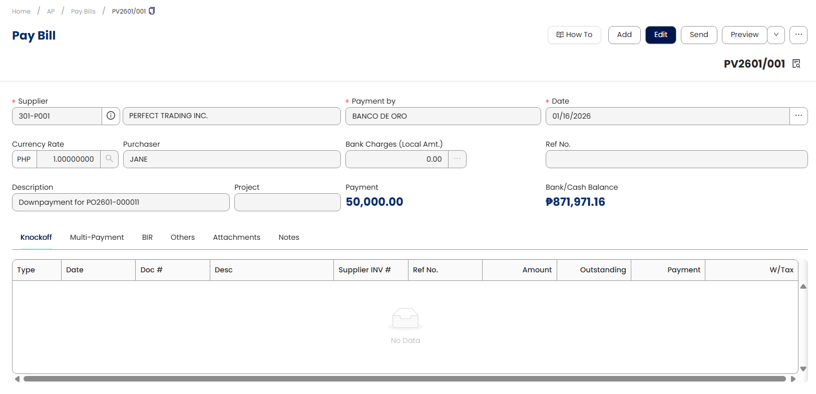 To properly reflect the transaction and clear the payable, the Supplier Knock Off form is used to match the advance payment with the bill.