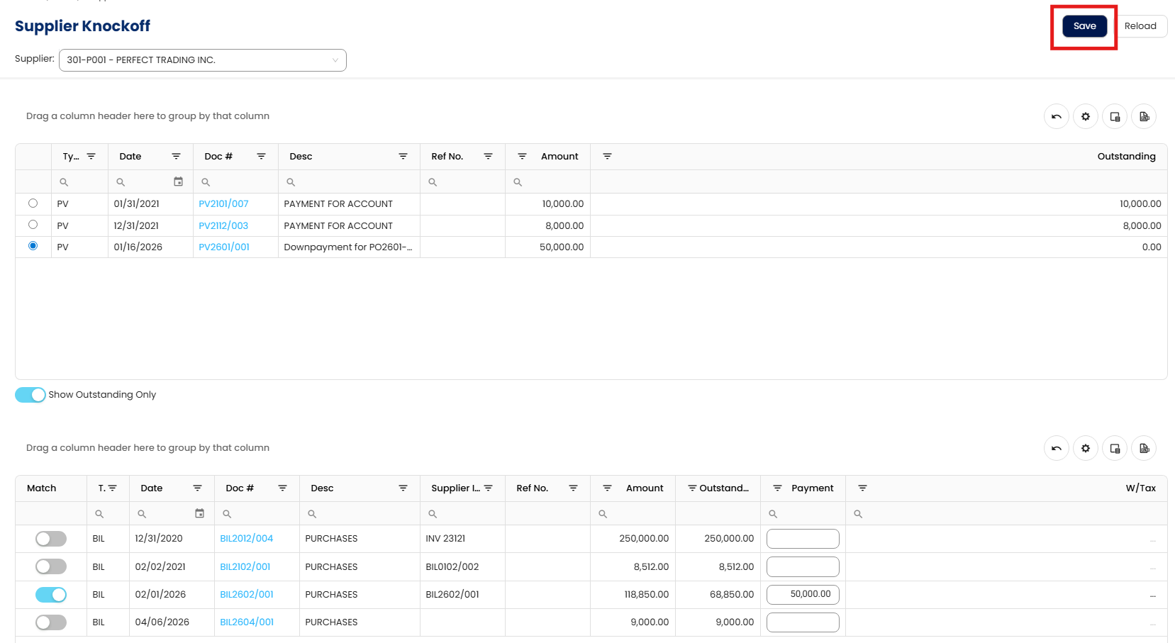 Click Save to complete the knock off process and update the supplier’s account with cleared transactions and updated balances.