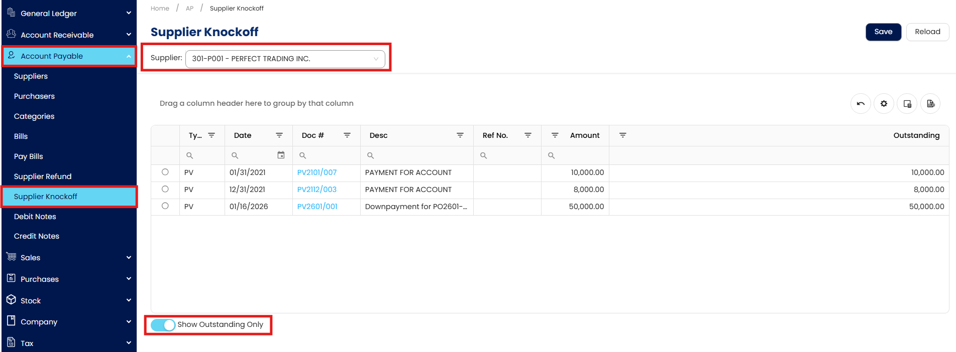 Navigate to Accounts Payable > Supplier Knock Off, select the specific supplier, and tick “Show Outstanding Only” to display open transactions.