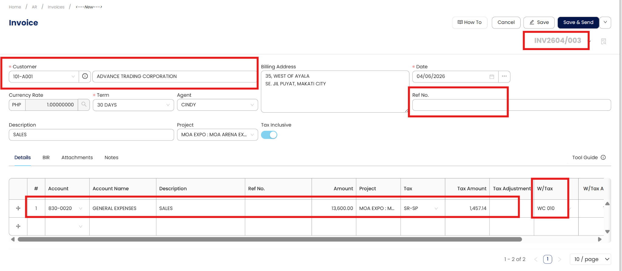 Complete the remaining fields in order: Invoice No., Customer details, Description, Amount Balance, Tax Code.