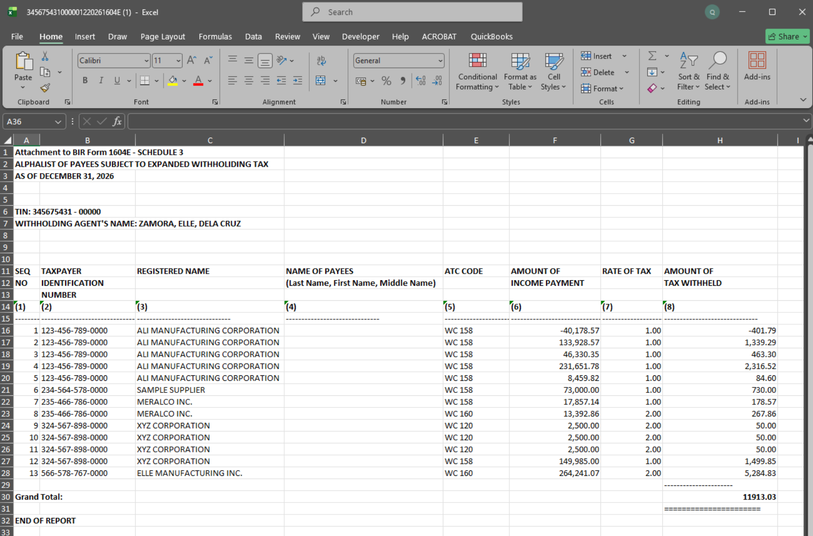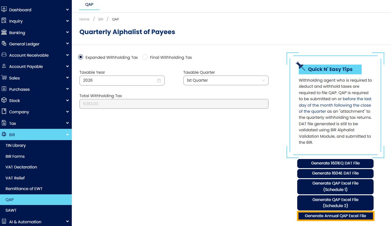 At year-end, Maria, an accountant, needs to file BIR Form 1604E. She must submit a complete list of all suppliers subject to expanded withholding tax. Instead of manually compiling the data, she generates the Annual QAP Excel file from the system, reviews it, and submits it together with the BIR report.